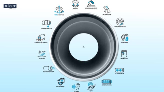 BLÜCHER® EuroPipe on kestävä ja työtunteja säästävä ratkaisu, jota voidaan käyttää maanpinnan ylä- ja alapuolella monenlaisissa sovelluksissa. Tämän muhviputkijärjestelmänpaino on vain kolmannes verrattuna perinteiseen valurautaputkesta tehtyyn ratkaisuun. Asentamiseen tarvitaan vain yksi henkilö, joten viemäröintiprojekteissa säästyyaikaa, rahaa ja työtunteja.